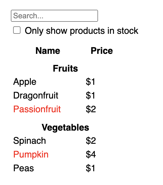 Jika Anda melihat ProductTable (lavender), Anda akan melihat bahwa header tabel (yang berisi label “Name” dan “Price”) bukan merupakan komponennya sendiri. Ini adalah masalah preferensi, dan Anda dapat memilih salah satu. Dalam contoh ini, header tersebut merupakan bagian dari ProductTable karena muncul di dalam list ProductTable. Namun, jika header ini menjadi kompleks (misalnya, jika Anda menambahkan pengurutan), Anda dapat memindahkannya ke dalam komponen ProductTableHeader sendiri.
